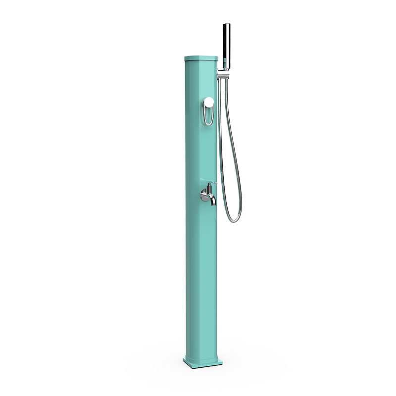 Cette douche compacte et élégante est dotée d'un corps en aluminium Thermolaqué et est équipée d'un rince pieds, d'un mitigeur et d'une douchette flexible.
