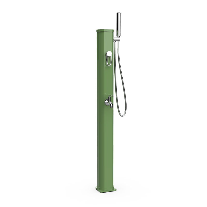 Cette douche compacte et élégante est dotée d'un corps en aluminium Thermolaqué et est équipée d'un rince pieds, d'un mitigeur et d'une douchette flexible.