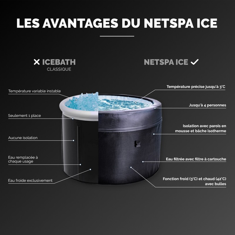 En tant que professionnel du bien-être, je trouve que le NetSpa Ice révolutionne la pratique du bain de glace en la rendant à la fois facile et accessible à tous. Ce produit innovant offre des bienfaits remarquables pour la santé, notamment la réduction du stress, l'amélioration du sommeil, et le renforcement du mental.