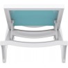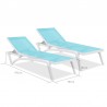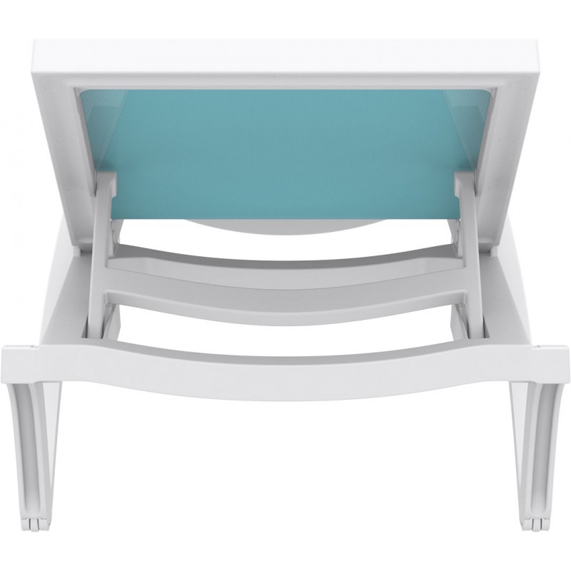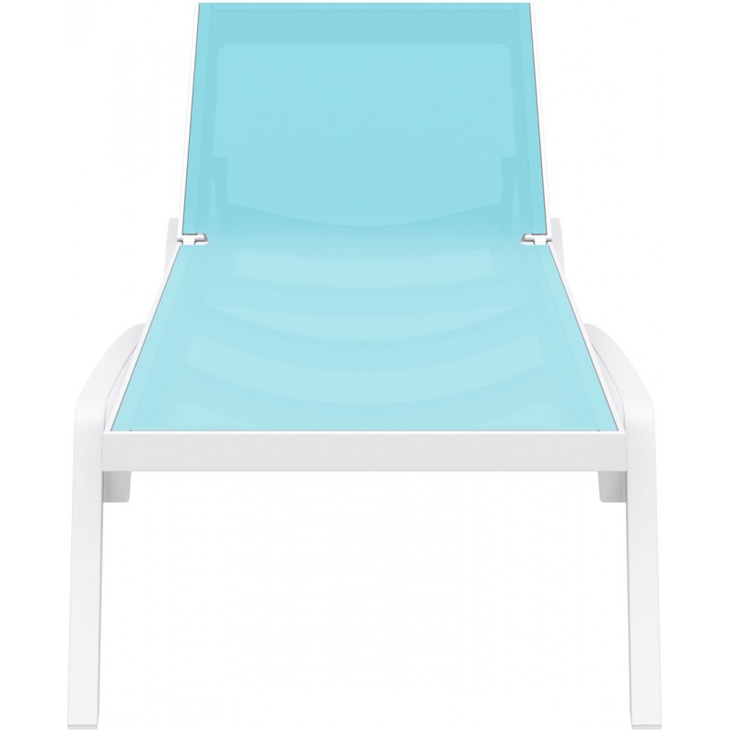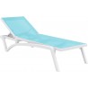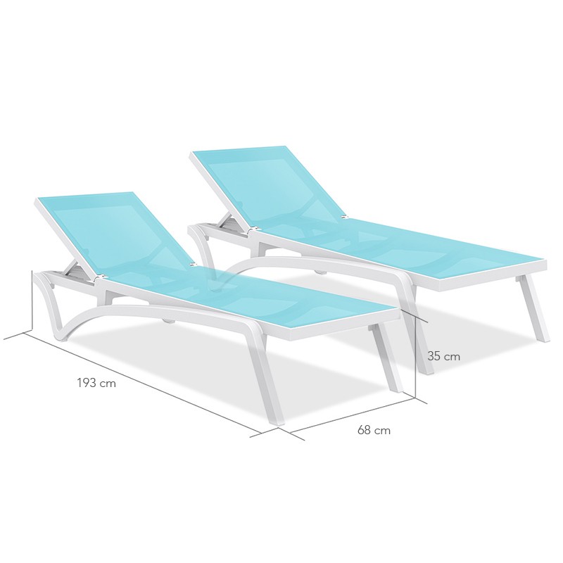 Ces transats sans accoudoirs sont conçus avec une structure tubulaire en résine renforcée de fibre de verre et revêtement en tissu synthétique respirant (remplaçable). Ces transats sont empilable, et le dossier est inclinable en 5 positions, avec pieds antidérapants et petites roues pour pouvoir le déplacer facilement