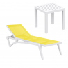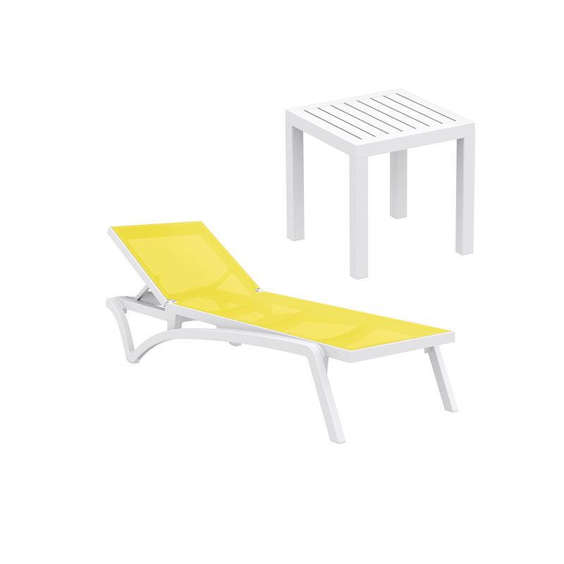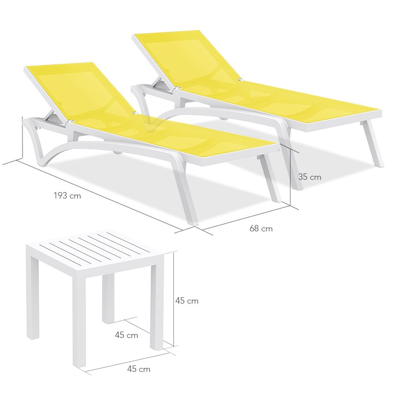 Ces transats sans accoudoirs sont conçus avec une structure tubulaire en résine renforcée de fibre de verre et revêtement en tissu synthétique respirant (remplaçable). Ces transats sont empilables et le dossier est inclinable en 5 positions, avec pieds antidérapants et petites roues pour pouvoir le déplacer facilement. Le pack inclus également une table d'appoint conçue en résine durable et résistante aux intempéries. Le cadre non métallique ne s'effiloche jamais, ne rouille pas et ne se décompose jamais. Il est protégé contre les UV pour éviter tout risque de décoloration. Peut être démonté. Pour une utilisation intérieure et extérieure.
