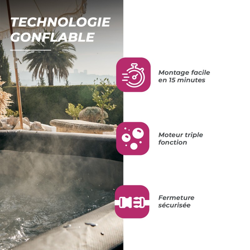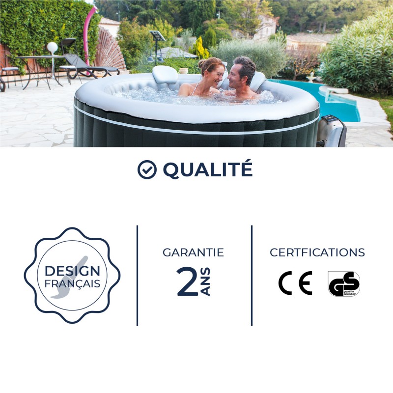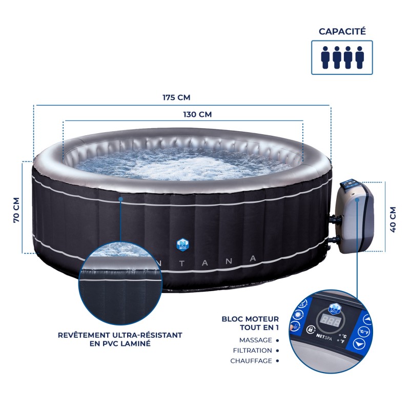 Compact et élégant, ce spa se gonfle et s'installe rapidement dans votre jardin aussi bien qu'en intérieur ! Idéal pour accueillir jusqu'à 4 personnes, le spa gonflable Montana est très robuste et confortable.
